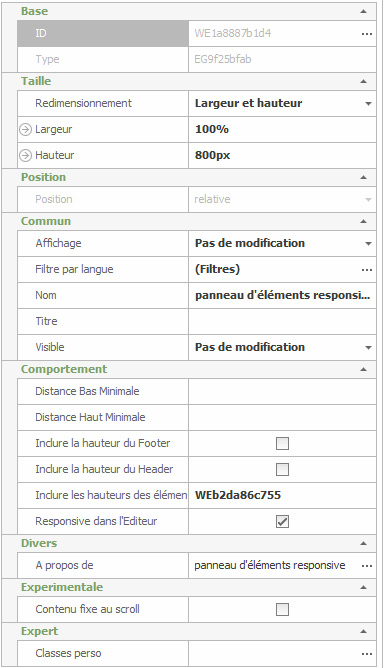 Vous pouvez ajouter une liste d'IDs séparés par une virgule, des éléments qui doivent s'afficher sur la même page (écran) que le panneau d'éléments responsive. La hauteur du panneau sera réduite en conséquence. C'est ce que nous avons fait avec notre élément WEMENU (un panneau d'éléments). Celui-ci tient compte de la hauteur de cet élément et s'y inscuste parfaitement. L'ID indiqué correspondant à l'ID du menu du calque Base.